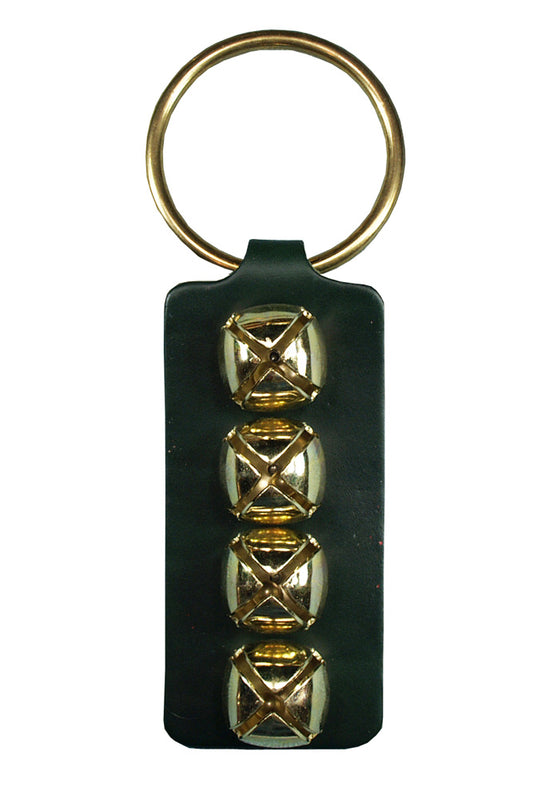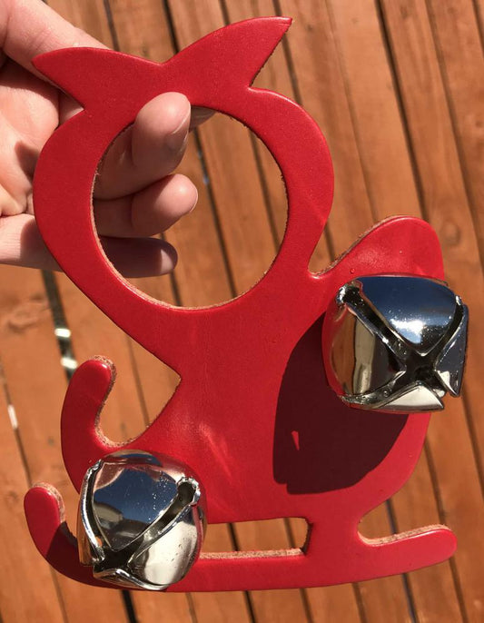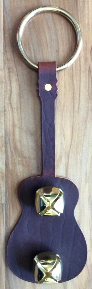 Only top quality oak tanned saddle leather is used. Each brass plated beel is hand placed with care. The 2 1/2" brass ring enhances the rich color of the fine leather. These cheerful Christmas door bells add a touch of beauty and charm to your home.